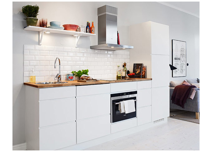 Kuhinja, zbog ograničenosti prostora, najbolje je da je minimalistička, svijetla i bez suvišnih detalja. Sofa, kao i obično, treba da bude u tonu sa zidovima, u nekoj svijetloj nijansi i jednobojna, kako ne bi dodatno opterećavala prostor svojim uzorkom. Krevet smjestite u dubinu stana, ako je riječ o pravougaoniku ili nekom nepravilnom obliku, a vizuelno ga odvojite od zone dnevnog boravka jednostavnim noćnim stolićem, ili pregradnom policom za knjige.