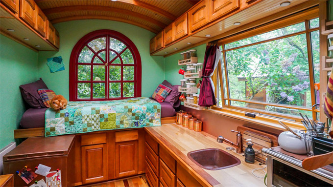 Male kuće obično imaju galerije za spavanje, ali je Lina umjesto toga na krov stavila prozor. Krevet se odlično uklopio uz zid na donjem kraju. Dovoljno je velik za dvoje, jer ima madrac na preklop.