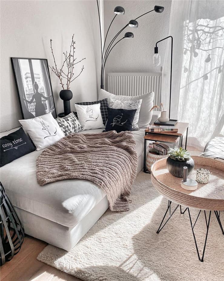 Počet ćemo od šema boja. Bijela je uvijek odličan izbor za manje prostore, barem kada su u pitanju zidovi. Tamniji zidovi vizuelno zatvaraju prostor, a to je nešto što sigurno ne želite u maloj dnevnoj sobi.