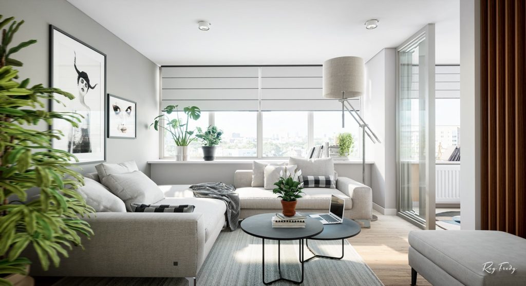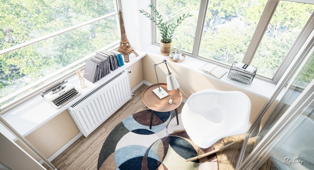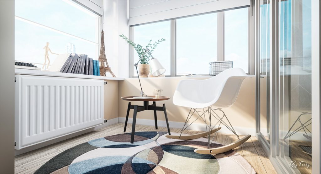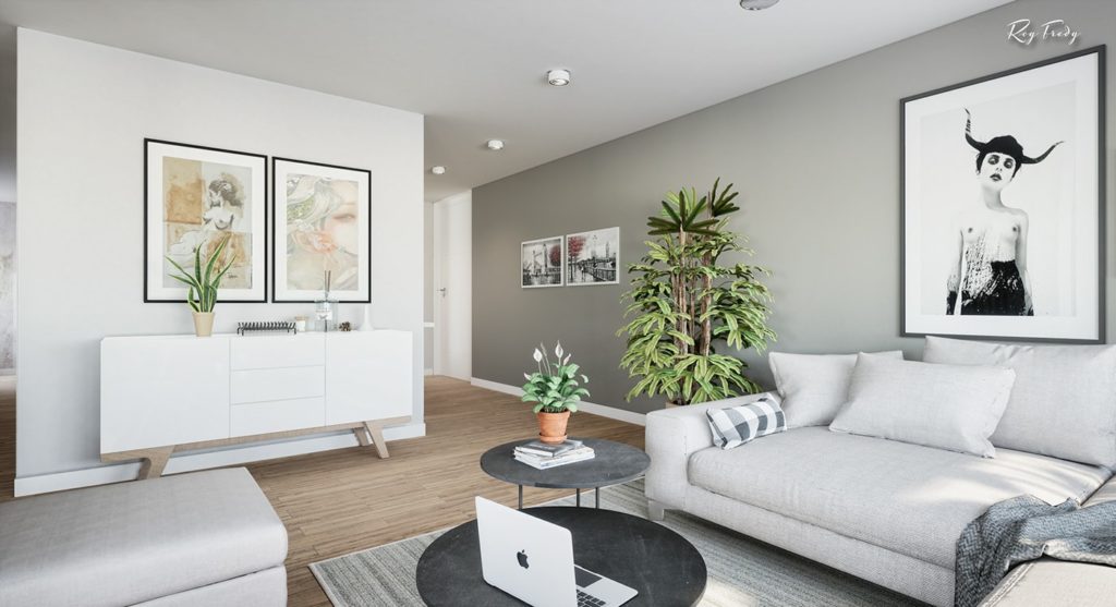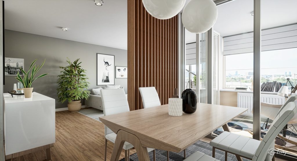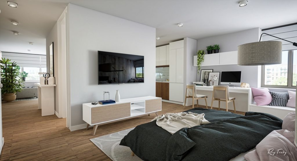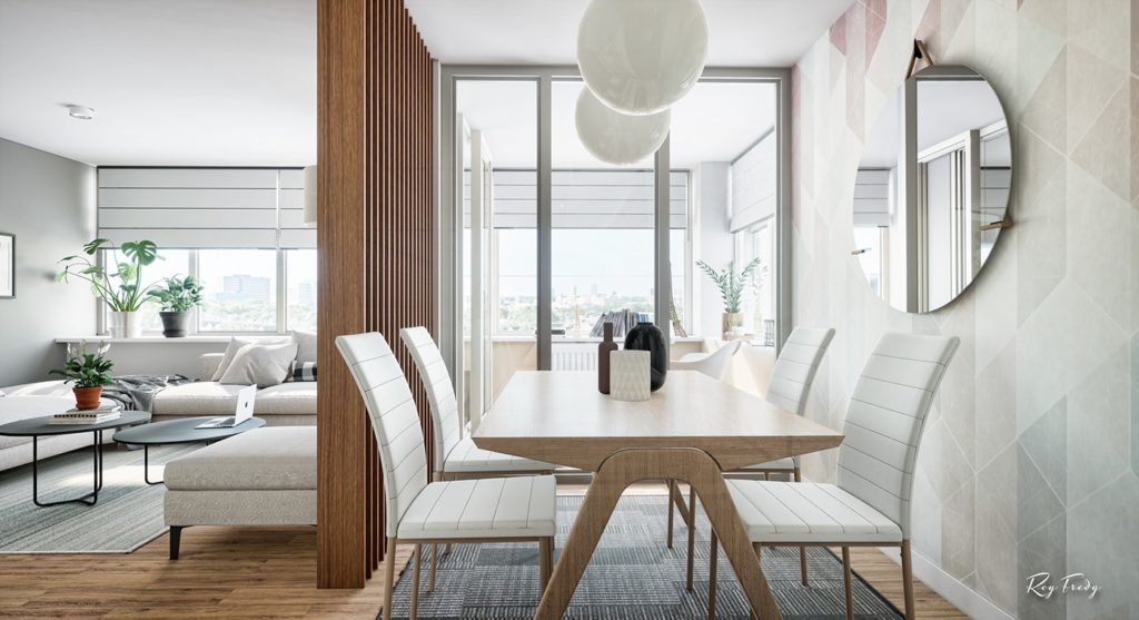 Prostorije su kružno raspoređene, i gledajući u smjeru kazaljke na satu ulaz u stan i ulaz u kupatilo nalaze se na 6 sati, te slijede dnevni boravak, prostor za čitanje i trpezarija, kuhinja, radni stol i krug zatvara spavaća soba. Ugodan prostor u kombinaciji bijele, sive boje i drvenih površina za jednu do dvije osobe.