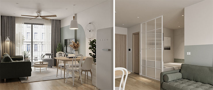 Uređenje malih prostora predstavlja izazov, ali i priliku za kreativna rješenja koja kombinuju funkcionalnost i stil. Stan od 30 kvadratnih metara, koji vam predstavljamo, odiše elegancijom zahvaljujući paleti boja u kojoj dominiraju nijanse dimno zelene, bijele i svijetlog hrasta. Ovaj sklad boja stvara mirnu i ugodnu atmosferu, idealnu za stanovanje.