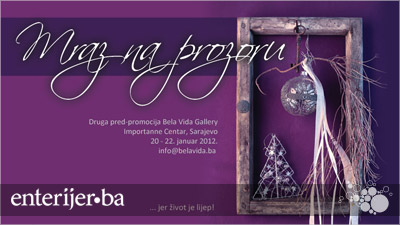 U susret februaru i svečanom otvaranju Bela Vida Gallery, Sarajlije i Sarajke će, u periodu od 20. do 22. januara, u centralnom holu Importanne centra moći vidjeti i prošetati kroz 'Mraz na prozoru' - postavku začaranu magijom snijega, zime i bjeline, koja će kod posjetilaca proizvesti osjećanja odmora i užitka. Nakon „Noći od cimeta“ kojima se na simboličan način zatvorila stara godina, ova stilska postavka namještaja i detalja za dom zasigurno će privući pažnju svojom raskošnom ljepotom i nesvakidašnjom prostornom kompozicijom.