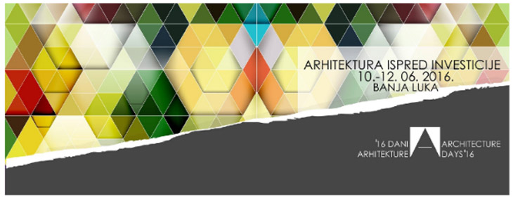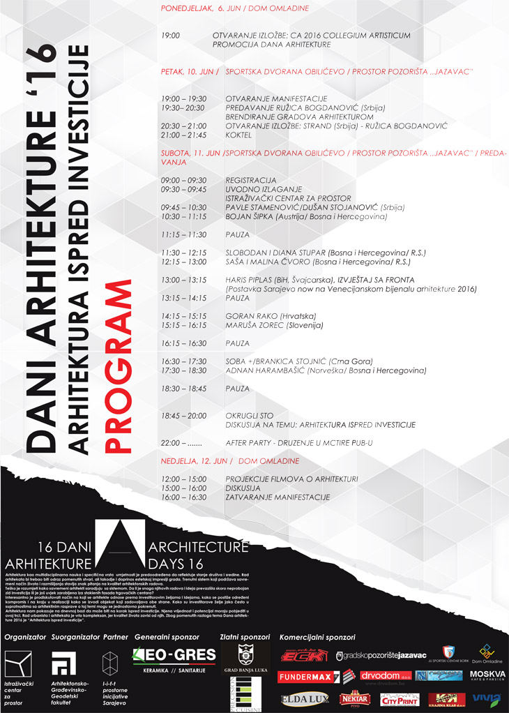 Dane arhitekture 2016. Istraživački centar za prostor organizuje u saradnji s Arhitektonsko-građevinsko-geodetskim fakultetom Univerziteta u Banjoj luci i organizacijom “l-i-f-t prostorne inicijative”. Tema ovogodišnjih Dana arhitekture “Arhitektura ispred investicije” je definisana kao zajednička Danima arhitekture održanim u Sarajevu od 13. do 22. maja u organizaciji partnerske organizacije LIFT. U središte se stavlja problem transformacije savremenog grada u odnosu na različite aspekte koji definišu arhitektonsku i urbanističku produkciju.