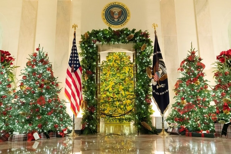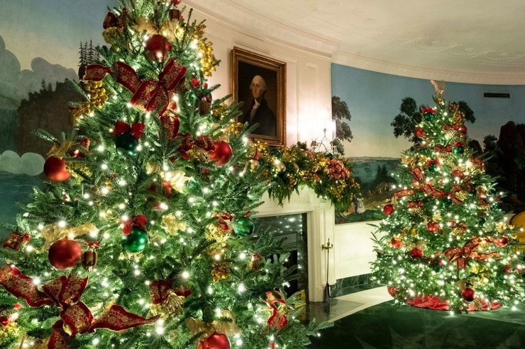 Čak 62 drvca, 106 vijenaca, 3200 lampica, 17.000 mašnica i više od 150 vrsta cvjetnih aranžmana krasi Bjelu kuću ove godine. Tu je i 365 metara raznih girlandi.