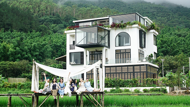 Moderna, trospratna kuća ima zajednički stambeni prostor u prizemlju i privatne spavaće sobe na spratu. Boravak je napravljen u staklu i pruža pogled na okolna rižina polja. Namještaj i dio ukrasa su nabavile u Indiji i Maroku.