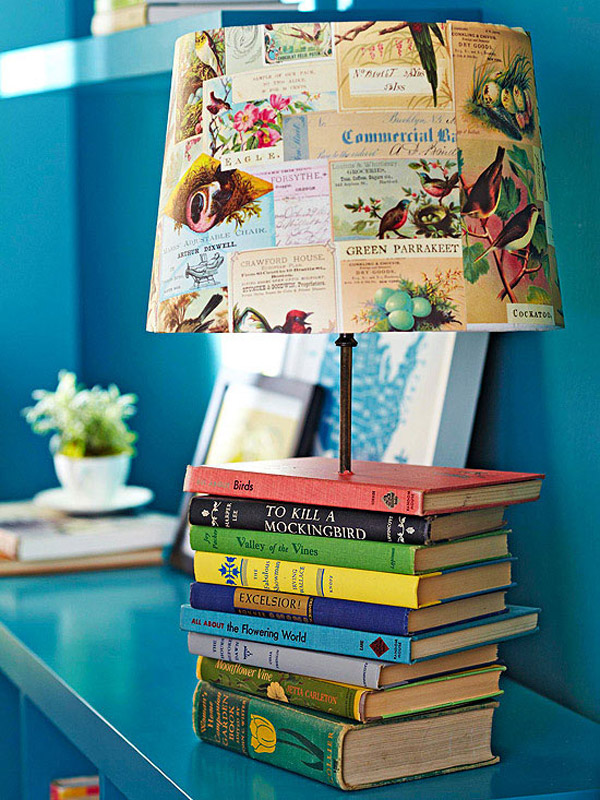 Na sredini knjige probušite znatno veću rupu od šipke vaše stolne lampe i redajte knjige do željene visine. Da biste upotpunili izgled, prekrijte abažur lampe samoljepljivim ukrasnim papirom ili stranicama koje ste izrezali iz knjiga.
