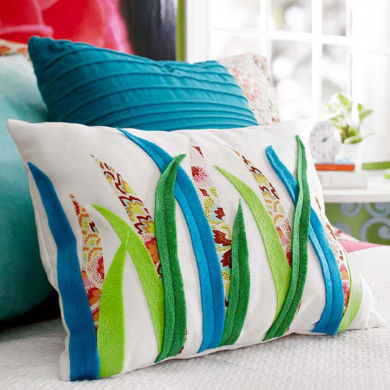 Na jastuku označite mjesta na koja ćete postaviti vlati trave. Uzmite različite materijale i isijecite ih u oštre oblike. Prva dva sloja vlati zalijepite ljepilom za tkaninu.
