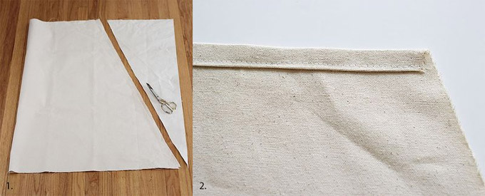 Preklopite platno od dva metra (kao što vidite na fotografiji). Od gornje desne ivice označite 18 cm. Linijarom napravite liniju do lijeve gornje ivice i izrežite. Zatim ponovo otvorite platno.