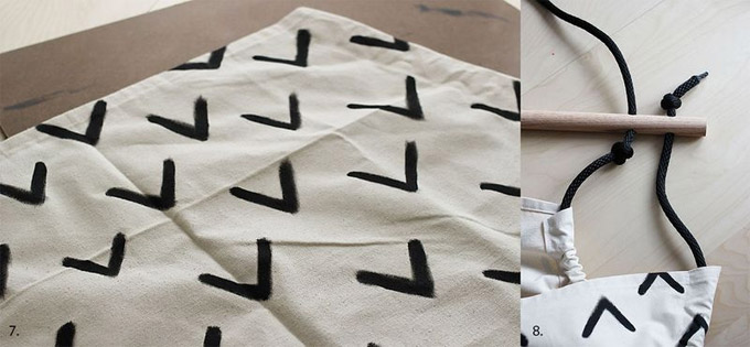 Zvežite čvor od konopa na jednom kraju vašeg konopca (koji je dužine 40 cm) tako da ostane oko 8 cm na kraju (rep). Istopite kraj tako da se ne razdvaja. Provucite ga kroz krajnju rupu štapa i dalje kroz najširu stranu vašeg platna. Onda zavežite čvor oko 8 cm od drugog kraja (kao na početku). Provucite ga kroz drugi džep. Ukoliko vaše dvije strane nisu jednake, prilagodite čvorove prije nego ih zategnete.