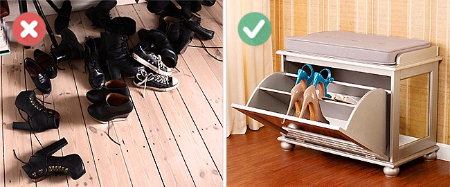 Ponekad nam je potrebno da različitu obuću imamo lako dostupnu zbog neizvjesnih vremenskih uslova. U ovom slučaju stručnjaci savjetuju pronalaženje načina za spremanje svih čizmi, patika i cipela bez da vaši gosti nabasaju na njih. Možete koristiti otoman sa ladicom ili ormarić za cipele i kapute. Kao rezultat toga, dobit ćete više slobodnog prostora, a vaš hodnik će biti mnogo organizovaniji.