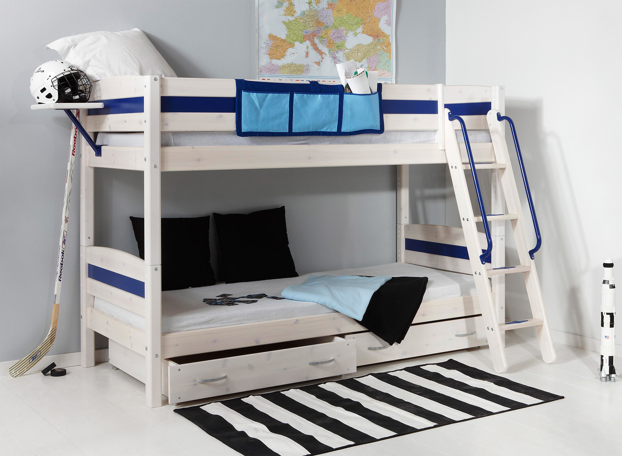 Ležaji na sprat stari su i pouzdani recept za dobijanje dva kvadratna metra. Djeca su oduševljena takvim rješenjem. Naša je, pak, briga gornji ležaj – kako osigurati dobar prilaz ležaju i pobrinuti se za sigurnost od pada uz pomoć ograde, mreže ili sličnih zaštitnih mjera.