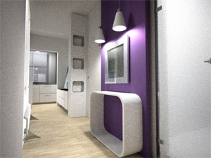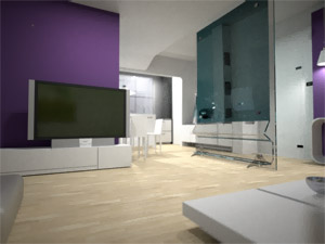 Na slikama je prikazan funkcionalan i komforan prostor opremljen modernim namještajem, dok je pod obložen drvenim gredicama. Ako ste ljubitelj jarkih boja, imate opciju da manje zidove obojite u u nešto veselije i jače boje - što je u našem slučaju ljubičasta, primjenjena u hodniku i na jednom zidu u dnevnom boravku.