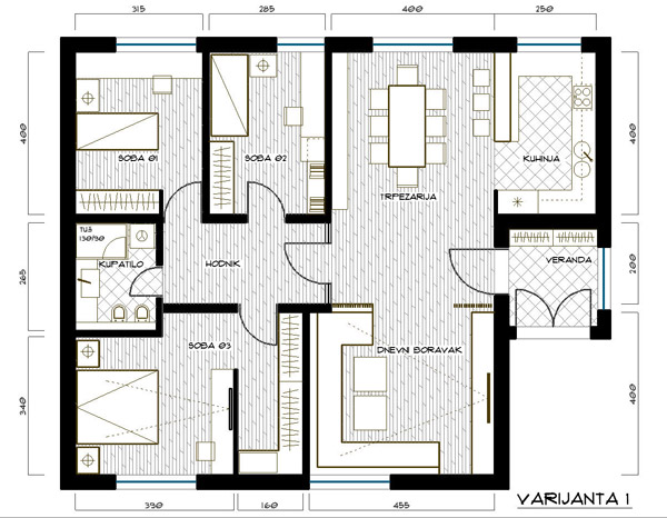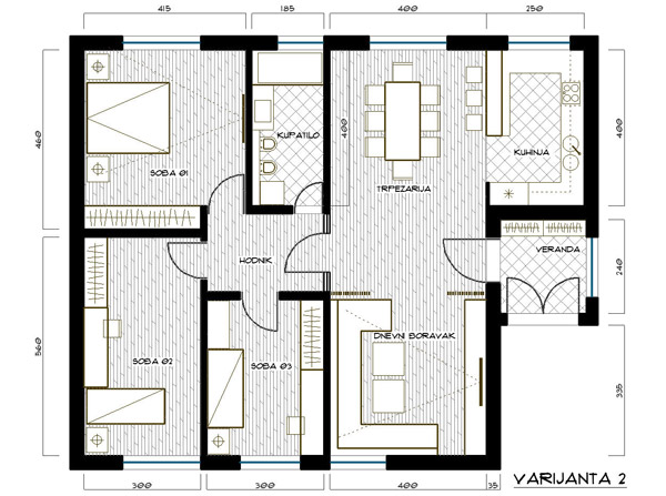 U varijanti 1 postojeća pozicija kupatila bi se zadržala zbog lakšeg izvođenja vodovodnih i kanalizacionih instalacija, a sve sobe i kupatilo povezani su preko centralnog degažmana. Zbog ostvarivanja veće kvadrature, dvije manje sobe sam stavio na sjevernu, a glavnu spavaću sobu sa integrisanim garderoberom na južnu stranu. U ovoj varijanti zadržani su svi postojeći vanjski otvori.