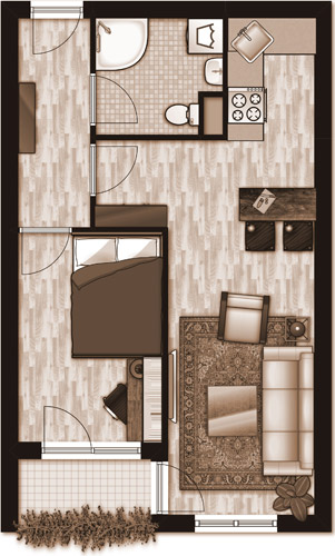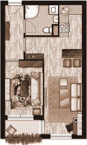 U prvoj varijanti dnevni boravak pretpostavlja i mali radni kutak sa priručnom bibliotekom. Kauč na razvlačenje (bijele ili sive boje) sa niskim staklenim stolom i tabureom čini prostor lakšim i prozračnijim. Prolaz do lođe je siguran. Trpezarijski stol, gabaritno, zauzeo bi mnogo prostora, pa savjetujemo šank sa dvije barske stolice.