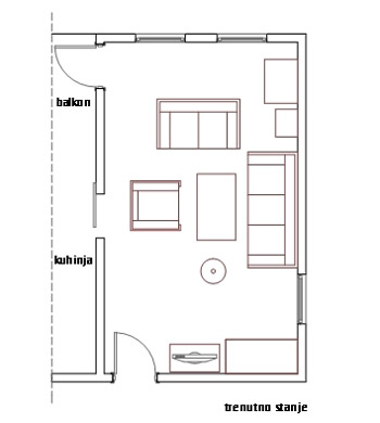 Dimenzije dnevne sobe su 6 m x 3,5 m, tlocrt sa detaljnijim dimenzijama, sadašnjim rasporedom te slike namještaja Vam šaljem u prilogu.
