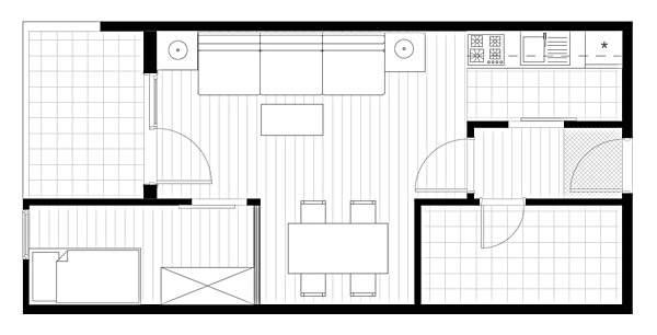 Ovaj prijedlog podrazumijeva dislociranje kuhinje, ali zauzvrat nudi cjelovitu dnevnu zonu i izolovanu noćnu zonu. Također nudi jedno moderno rješenje dnevne zone (openspace). Ovde je uočljiv nedostatak prirodne svjetlosti u dječijoj sobi. Ovakvi slučajevi se uglavnom rješavaju time da se između osvijetljene i neosvijetljene prostorije postavlja pregrada od zamućenog pleksiglasa koja propušta izvjesnu količinu dnevne svjetlosti, pri tome pružajući dozu intime.