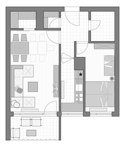 Dakle, smatram da biste trebali dnevni boravak organizovati bliže terasi, tako što ćete „zatvoriti“ jedna vrata između kuhinje i trpezarije, a trpezariju organizovati pored ostave u dnevnom boravku. Vrata ostave mogu biti klizna, tako da zauzimaju manje prostora. Na prijedlogu koji ste dostavili komunikacija do kuhinje je malo duža i prolazi se kroz čitav dnevni boravak. Predlažem Vam da ulaz u kuhinju bude direktno iz hodnika, što je praktičnije pri unošenju stvari i slično. Kuhinju možete organizovati prema rasporedu sa osnove, sa planiranim „leptir“ vratima, tako da se olakšava komunikacija u oba smjera. Ovakav raspored nudi zasebnu cjelinu dnevnog boravka koja je vezana za terasu, a kretanje između kuhinje i trpezarije ne ometa dnevni odmor .
