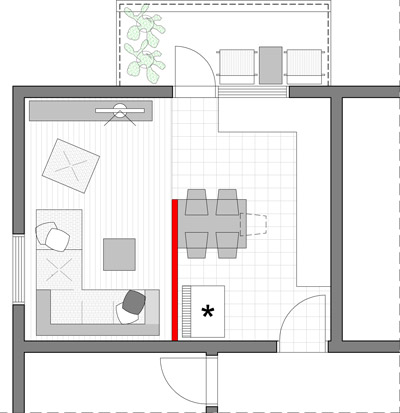 Ono što vam predlažem jeste da na neki način odvojite ove dvije zone – odmaranje i objedovanje. Odvajanje možete postići postavljenjem kliznog lakog panela ili nekog oblika „harmonika“ vrata - crvena pregrada na osnovi. Umjesto panela možete postaviti i plitke police za knjige i sitnice, izrađene po mjeri, od poda do plafona.