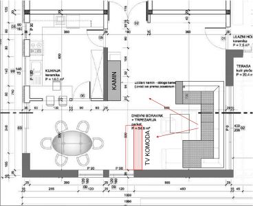 Na vašoj osnovi vidim da ste prvobitno planirali smjestiti garnituru uz veliku prozorsku površinu, da 'gleda' ka kaminu. Ukoliko je to vaša nepromjenjiva odluka, onda se položaj TV komode sam po sebi nameće – između trpezarije i dnevnog boravka. Jasnije će vam biti kada pogledate varijantu br. 1, u nastavku.