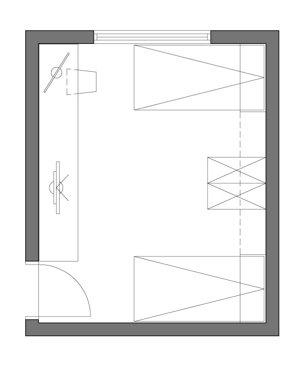 Po pitanju razmještaja elemenata, nemate baš mnogo varijanti, s obzirom da treba zadržati funkcionalnost prostora. Krevete možete razdvojiti, te ih pomjeriti svaki ka svom zidu, a duple ormare, ukoliko je moguće, postaviti između kreveta. Ovom intervencijom bi dobili na neki način dvije zone, a prazan prostor na sredini sobe djelovat će veći. Ormare možete čak okrenuti „leđima" jedan uz drugi, i bočno nasloniti uz zid. Tako bi se između kreveta pojavila i na neki način vizuelna, fizička barijera, koja bi još jasnije definisala dvije zone za dva korisnika.