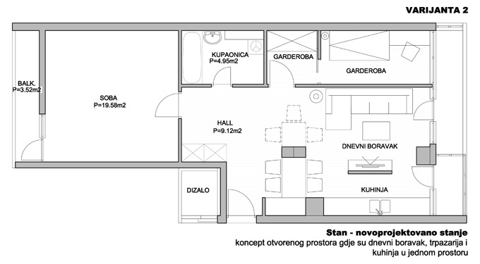 Druga varijanta predstavlja malo moderniji pristup. S obzirom da nisam imala podatke šta se od postojećih zidova može ukloniti, te šta su konstruktivni elementi, pokušala sam na osnovu pretpostavke osmisliti jedan moderan životni prostor po principu "loft" dizajna. U ovoj varijanti dnevni boravak, kuhinja i prostor za trpezarijski sto su spojeni u jedinstven prostor koji nije striktno odvojen od hodnika i ulaza u stan. Nova soba pozicionirana je pored kupatila, a u nju se ulazi iz garderobe, koja je također nova prostorija. Ovaj koncept Vam može poslužiti kao polazna osnova od koje ćete dalje razviti ideju rekonstrukcije Vašeg stana po principu lofta, a imajući u vidu postojeće stanje i konstruktivne zahtjeve.