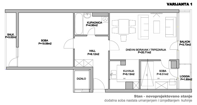 Prva varijanta je ono što se prvo nameće kao najlogičnije rješenje: kuhinju izmjestiti na desno, u unutrašnjost stana, a na tom mjestu predvidjeti sobu, dimenzija dovoljnih za jednu osobu. Nova soba bi imala zasebnu lođu i dovoljno prirodnog svjetla.