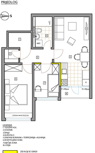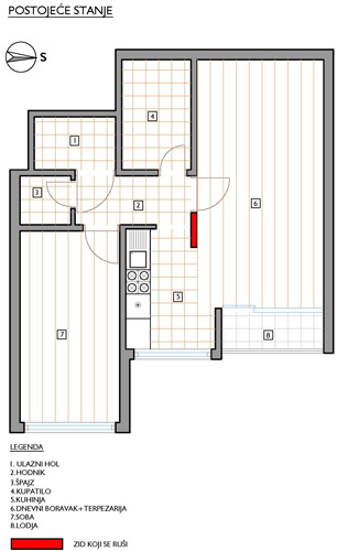 Postoji mogućnost iskorištavanja prostora pred ulaznim vratima stana koji bi imao svjetlo sa zapadne strane, širine 120cm i visine 245cm ili manje. Svi vanjski, kao i zid između spavaone i kuhinje, su noseći.