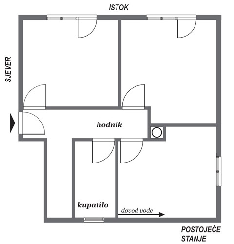 nakon uvida u Vaš upit i analiziranja skice koju ste mi poslali, došla sam do nekoliko mogućih rješenja za Vaš stambeni prostor. Predstavit ću Vam tri varijantna rješenja, koja sam poredala počevši od onog sa najmanje izmjena u smislu rušenja i dograđivanja. U sva tri slučaja kuhinju sam predvidjela u dijelu tlocrta koji je za to najlogičniji, a gdje ste spomenuli da se nalazi i sam dovod vode. Dalje razvođenje ne bi značajno pomoglo u kvalitetnijoj organizaciji prostora.