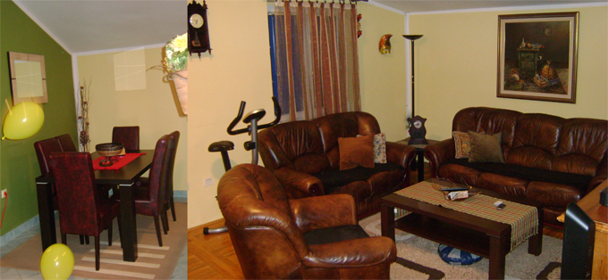 S obzirom da je namještaj u Vašem dnevnom boravku i trpezariji tamno smeđe boje, tu bi bilo najbolje primjeniti kontrastnu kombinaciju boja pri čemu jedna boja ima glavnu ulogu. U Vašem slučaju to je smeđa boja, a druga joj se podređuje.