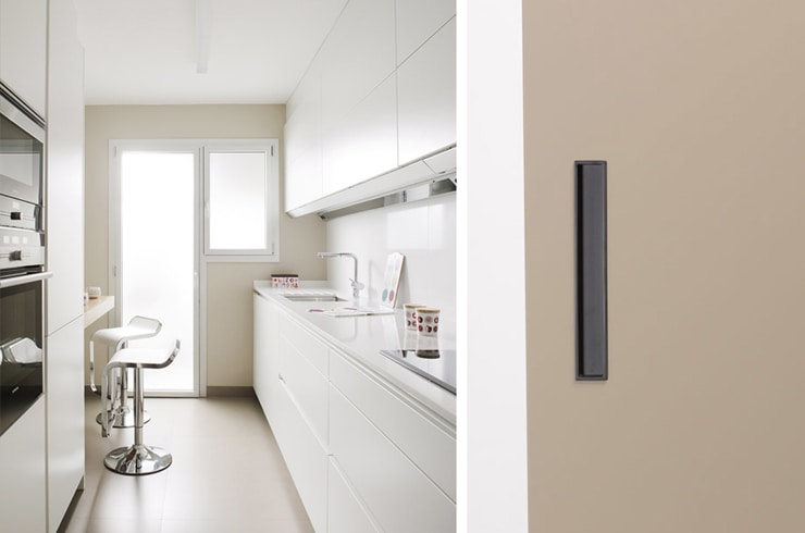 U uskim prostorima, vrata bez detalja će pojednostaviti prostor i učiniti ga širim. Ukoliko uz to odaberete vrata koja reflektuju svjetlost, uska kuhinja će izgledati puno šira.