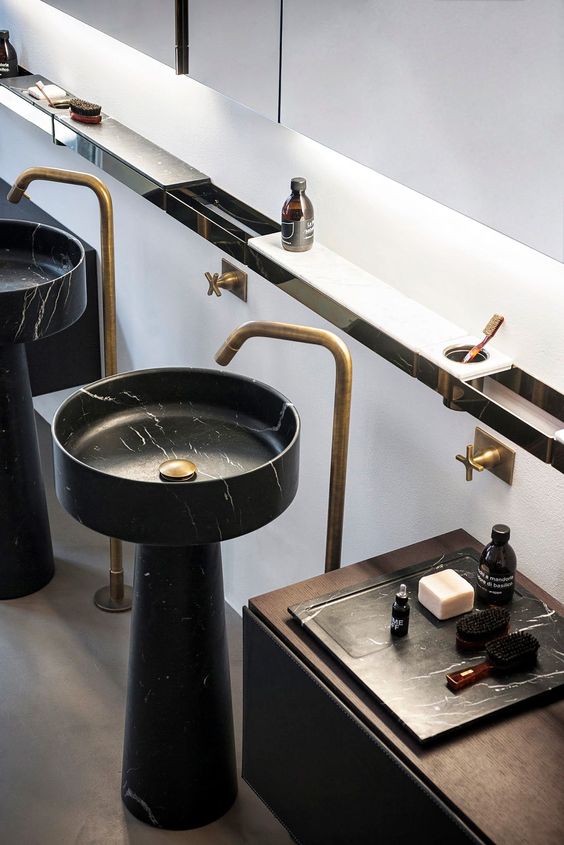 Savremeni slobodnostojeći umivaonik uz estetske zadovoljava i praktične potrebe. Opremljen je policama za odlaganje, a prema podu se postepeno sužava, tako da zauzima manje prostora.