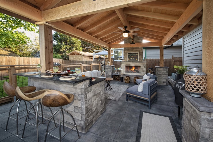 Ako volite roštiljati na otvorenom, razmislite i o kaminu, koji će vašim druženjima dodati ugodnu toplinu. Vodite računa da je dovoljno udaljen od stola da možete slobodno prolaziti te da uz njega ima dovoljno mjesta za pripremu i odlaganje hrane. Uvijek je korisno imati neki pomoćni stolić sa strane ili kolica za posluživanje.